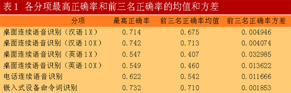 從各分項前三名的正確率方差可以看出,漢語桌面連續(xù)語音識別和嵌入式設備命令詞分項中各系統(tǒng)的性能差異較小,而英語桌面連續(xù)語音識別,特別是一倍實時任務中各系統(tǒng)性能差異較大。這是因為當前語音識別的研究重點在于前者,研究者較多,研究也比較深入,而英語的識別相對來說研究者較少。