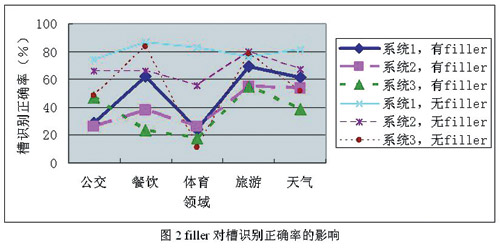 對于電話連續(xù)語音識別來說,由于錄制環(huán)境是辦公室真實環(huán)境,因此噪音并不是影響性能的主要因素。電話連續(xù)語音識別分為5個子領域,每個子領域各有一套語法。評測句子由語法生成的有效成分在前后加上任意長的填充詞(filler)構成,如語法生成的句子為“從天安門到中關村怎么坐公交車”,而實際錄制的句子是“你好,請問從天安門到中關村怎么坐公交車,可以查到嗎?”,其中的“你好,請問”和“可以查到嗎”就是filler。由分析可以發(fā)現(xiàn),不同領域內(nèi)的槽識別正確率相差很大。這主要有兩個原因,一是不同領域的語法復雜度不同,二是不同領域內(nèi)有filler的句子所占比例不同。為了進一步衡量filler對識別的影響,選取三個識別系統(tǒng),將有filler的句子和沒有filler的句子分別計算識別率,統(tǒng)計結果如圖2所示。從圖中可以看出,filler對識別的影響是相當大的,無filler的句子比有filler的句子識別正確率可以高幾十個百分點。