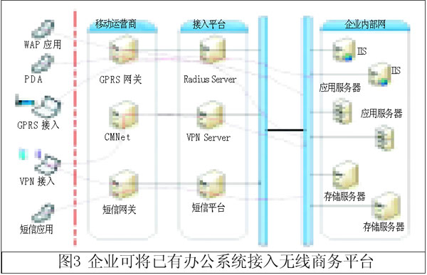 這里介紹的無線商務(wù)平臺(tái)適合沒有成型信息系統(tǒng)的企業(yè)接入,對(duì)于企業(yè)已經(jīng)建有辦公系統(tǒng)的情況,可以提供專線接入的無線商務(wù)解決方案(如圖3所示),企業(yè)通過專線接入無線商務(wù)平臺(tái),這種情況需要對(duì)企業(yè)辦公系統(tǒng)進(jìn)行一定的改造來實(shí)現(xiàn)全部移動(dòng)辦公功能。