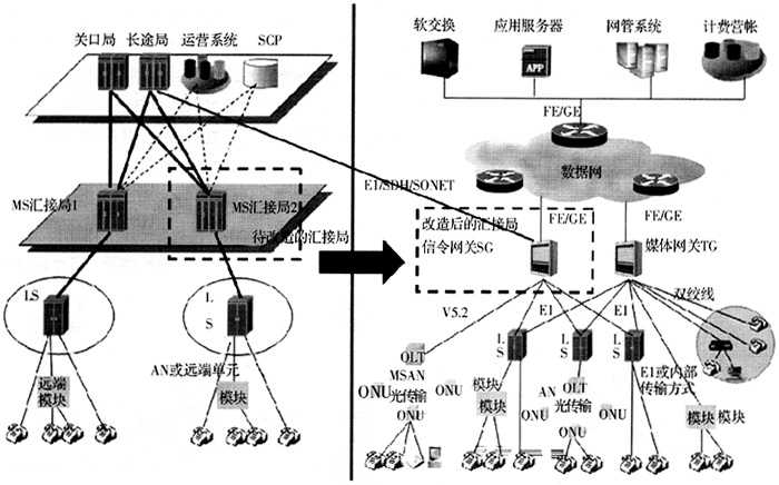 改造后的匯接局和端局之間通過ISUP中繼方式連接,接入網(wǎng)絡(luò)通過V5中繼接入。如果原有匯接局直接下掛部分用戶,這部分用戶可以采用中繼媒體網(wǎng)關(guān)下掛接入單元的方式接入。原有端局用戶的數(shù)據(jù)管理和業(yè)務(wù)提供統(tǒng)一由軟交換支持,端局用戶的業(yè)務(wù)觸發(fā)提升到匯接局,避免對(duì)端局的改造,同時(shí),用戶可以使用軟交換業(yè)務(wù)平臺(tái)提供的各類智能業(yè)務(wù)和增值業(yè)務(wù)。匯接局網(wǎng)絡(luò)優(yōu)化后,原有端局無法提供的業(yè)務(wù)均可以由軟交換業(yè)務(wù)系統(tǒng)提供。