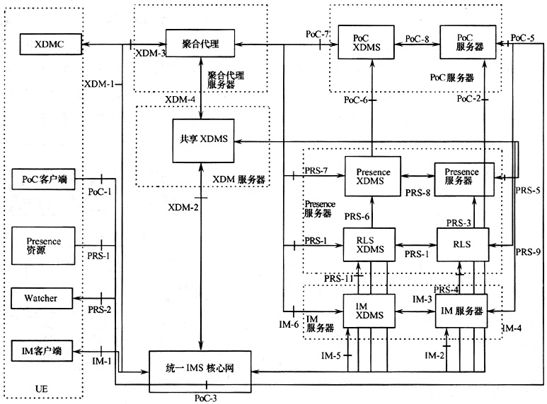 OMA雖然定義了XDM、Presence(呈現(xiàn))、Instant Message和PoC等業(yè)務(wù)的功能實(shí)體和參考點(diǎn),但是為了在網(wǎng)絡(luò)中實(shí)現(xiàn)以上業(yè)務(wù),需要將OMA定義的功能實(shí)體和參考點(diǎn)映射成物理實(shí)體和協(xié)議,確定運(yùn)營商開放此類業(yè)務(wù)對(duì)設(shè)備和協(xié)議的要求,圖2給出了一種映射的方式。XDM服務(wù)器包含的共享XDMS功能提供公共群組的能力,有利于用戶在使用PoC、IM等業(yè)務(wù)時(shí)也能共享此群組。