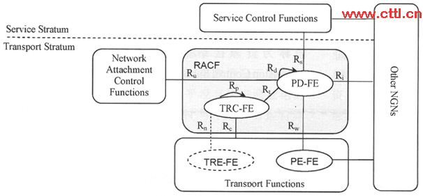 RACF由策略決策功能實(shí)體PD-FE和傳送資源控制功能TRC-FE兩個(gè)功能實(shí)體組成。PD-FE基于網(wǎng)絡(luò)策略規(guī)則、業(yè)務(wù)控制功能SCF提供的業(yè)務(wù)信息、網(wǎng)絡(luò)附著控制功能NACF提供的傳送層簽約信息,以及TRC-FE提供的資源接納決策結(jié)果,做出網(wǎng)絡(luò)資源接納控制的最后決策。可以基于每個(gè)流對(duì)傳送層的策略執(zhí)行功能實(shí)體。PE-FE下發(fā)資源接納控制策略。TRC-FE負(fù)責(zé)收集和維護(hù)傳送網(wǎng)的拓?fù)浜唾Y源狀態(tài)信息,基于拓?fù)、連接性、網(wǎng)絡(luò)、節(jié)點(diǎn)資源的可用性以及接入網(wǎng)中的傳送層簽約信息等網(wǎng)絡(luò)信息控制資源的使用,提供傳送網(wǎng)絡(luò)接納控制的決策。PD-FE通過Rt參考點(diǎn)請(qǐng)求TRC-FE檢測或者決定所請(qǐng)求的媒體流路徑上的QoS資源。