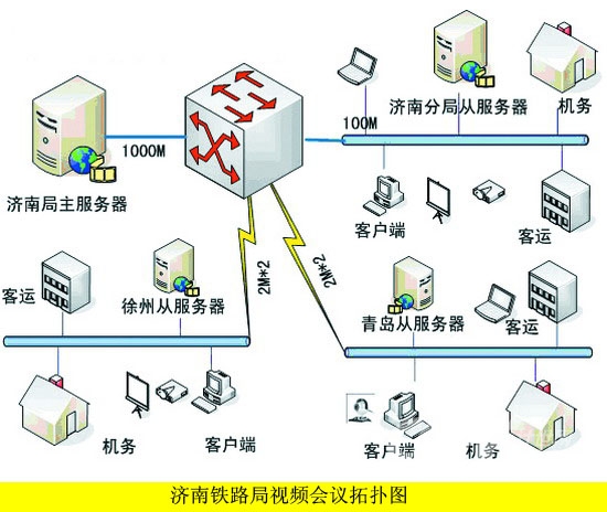 由于路局改革后組織結(jié)構(gòu)的特點,決定了跨地域會議較多,如濟南和徐州、青島之間召開的部門級別的會議比較頻繁,加上三地之間的帶寬制約,本方案采用了主從服務(wù)器的系統(tǒng)架構(gòu),1主3從,主服務(wù)器設(shè)置在路局網(wǎng)絡(luò)中心,原來濟南分局位置設(shè)置1臺從服務(wù)器,負(fù)責(zé)濟南地區(qū)的內(nèi)部會議,以及與其他2地的遠(yuǎn)程會議,同樣徐州、青島也各設(shè)置1臺從服務(wù)器。