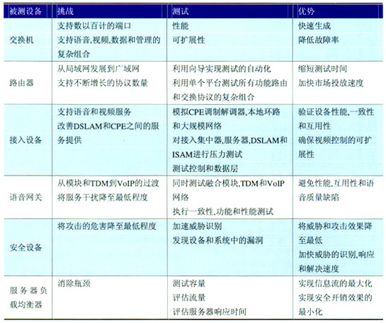 此外,思博倫還可以提供安全風(fēng)險(xiǎn)管理解決方案。服務(wù)商和網(wǎng)絡(luò)設(shè)備制造商可以生成真實(shí)的流量,并將其引入網(wǎng)絡(luò)中,然后監(jiān)視各種“惡意代碼”對單個(gè)設(shè)備和總體網(wǎng)絡(luò)性能造成的影響,從而對網(wǎng)絡(luò)和設(shè)備中可能存在的漏洞進(jìn)行周全的測試。表1為思博倫基礎(chǔ)設(shè)施測試的挑戰(zhàn)和優(yōu)勢。
