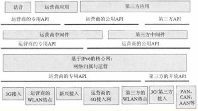 在某種意義上,下一代網(wǎng)絡(luò)必須是一種可編程的、基于IP的網(wǎng)絡(luò),這必然要求XG為應用開發(fā)提供強大的、方便的、定義明確的API。對于一些業(yè)務(wù)提供商來說,API思想本身并非僅僅是一個基本概念。目前,公共API是指所有第三方都可用的API,它包括標準的、開放的API子集。另一方面,專用API是指由某個公司控制、僅僅在公司內(nèi)部或合作伙伴內(nèi)部可用的API。圖1給出了下一代網(wǎng)絡(luò)API體系結(jié)構(gòu)的一種高級分類方法。