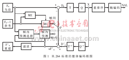 Abstraction Layer),負責對數(shù)據(jù)進行打包和傳送。H.264編碼圖像通常分為三種類型:I幀、P幀、B幀。I幀為幀內(nèi)編碼幀,其編碼不依賴于已編碼的圖像數(shù)據(jù)。P幀為前向預測幀,B幀為雙向預測幀,編碼時都需要根據(jù)參考幀進行運動估計。同時,H.264在提高圖像傳輸容錯性方面做了大量工作,重新定義了適于圖像的結構劃分。在編碼時,圖像幀各部分被劃分到多個Slice結構中,每個Slice都可以被獨立編碼,不受其他部分影響。Slice由圖像最基本的結構——宏塊組成,每個宏塊包含一個16×16的亮度塊和兩個8×8的色度塊。H.264標準的整體編碼框圖如圖1所示。編碼過程中,原始數(shù)據(jù)進入編碼器后,當采用幀內(nèi)編碼時,首先選擇相應的幀內(nèi)預測模式進行幀內(nèi)預測,隨后對實際值和預測值之間的差值進行變換、量化和嫡編碼,同時編碼后的碼流經(jīng)過反量化和反變換之后重構預測殘差圖像,再與預測值相加得出重構幀,得出的結果經(jīng)過去塊濾波器平滑后送入幀存儲器。采用幀間編碼時,輸入的圖像塊首先在參考幀中進行運動估計,得到運動矢量。運動估計后的殘差圖像經(jīng)整數(shù)變換、量化和嫡編碼后與運動矢量一起送入信道傳輸。同時另一路碼流以相同的方式重構后,經(jīng)去塊濾波后送入幀存儲器作為下一幀編碼的參考圖像。