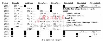 VIEWER工具,如圖4所示。在編寫完成匯編代碼后,可使用該工具觀察運行時流水線的情況。如果有stall等出現(xiàn),會給出原因,優(yōu)化人員根據(jù)工具分析結果重新更改代碼,提高執(zhí)行效率。