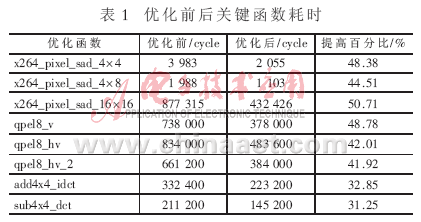 和SRAM 進行擴展,可以訪問多達132 MB的物理存儲器。根據(jù)這樣的特點,將執(zhí)行率更高的代碼放入L1指令緩存中,能使代碼更快地運行。IDE提供了Profile工具,能在運行時統(tǒng)計各個函數(shù)所占的CYCLE數(shù)和占總CYCLE數(shù)的百分比。通過將X264中比較耗時的部分算法代碼,如模式選擇部分代碼放入L1指令空間,能進一步提升運行效率。Profile工具統(tǒng)計結果同樣也是選擇需要使用匯編優(yōu)化函數(shù)的依據(jù),IDE可根據(jù)Profile結果對代碼進行優(yōu)化。X264代碼Profile統(tǒng)計結果與測試數(shù)據(jù)有很大關系,選用更類似以后應用場所的數(shù)據(jù)作為測試數(shù)據(jù),能使統(tǒng)計結果更接近以后的應用環(huán)境。為達到比較準確的統(tǒng)計結果,最好在Simulation階段進行統(tǒng)計。雖然這樣非常耗時,但為得到一個準確的統(tǒng)計作為參考依據(jù)是值得的。此外CACHE