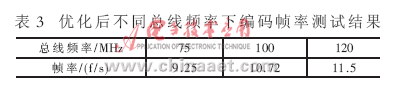 對于不同的總線頻率,優(yōu)化后編碼幀率不同,結果如表3所示,采用的測試序列為foreman。