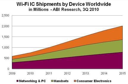 Wi-Fi技術(shù)現(xiàn)已被用于幾乎所有筆記本和上網(wǎng)本、智能電話和游戲設(shè)備。電話、音頻播放器、打印機(jī)、機(jī)頂盒以及其他消費(fèi)類電子設(shè)備對(duì)Wi-Fi技術(shù)的采用率也在不斷增加,來自Wi-Fi聯(lián)盟和多家調(diào)研機(jī)構(gòu)的數(shù)據(jù)印證了這種市場(chǎng)增長(zhǎng)趨勢(shì)。2009年,僅在中國(guó)銷售的具備Wi-Fi功能的筆記本電腦就達(dá)到800萬臺(tái),全球Wi-Fi設(shè)備認(rèn)證數(shù)量則增加了約50%,消費(fèi)類電子設(shè)備和電話數(shù)量增加了100%以上。截止到2010年7月,消費(fèi)類電子設(shè)施與電話類產(chǎn)品的認(rèn)證數(shù)量已經(jīng)超過了2009年全年數(shù)量,預(yù)計(jì)全年售出約8億臺(tái)Wi-Fi設(shè)備。