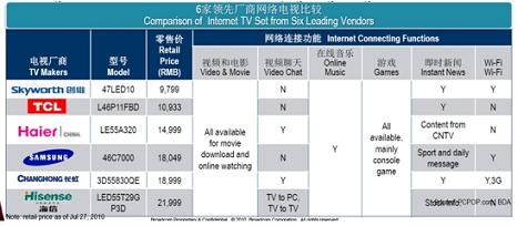 “相比國(guó)外廠商認(rèn)為規(guī)則尚不明確,持保守態(tài)度,國(guó)內(nèi)的電視機(jī)廠商比國(guó)外同行顯得更熱衷網(wǎng)絡(luò)電視。”Michael表示,“長(zhǎng)虹、TCL、海信、康佳及創(chuàng)維等廠商都在2009年推出了各自的網(wǎng)絡(luò)電視系列,網(wǎng)絡(luò)電視被國(guó)內(nèi)電視廠商視為開拓藍(lán)海市場(chǎng),獲取更多利用的機(jī)會(huì)。尤其在三網(wǎng)融合的背景下,網(wǎng)絡(luò)電視在中國(guó)被普遍認(rèn)為將有很大前景。”