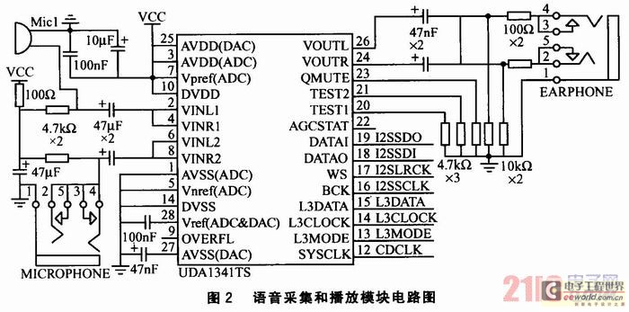 語音采集和播放模塊的作用是將音頻模擬信號轉(zhuǎn)換為數(shù)字信號,并對信號進(jìn)行PCM編碼。其電路如圖2所示。采用Philips公司的UDA1341 TS型立體聲音頻CODEC進(jìn)行音頻編解碼。該芯片提供2個(gè)麥克風(fēng)輸入,可實(shí)現(xiàn)單端輸入、差分輸入等靈活配置,并設(shè)置了可編程增益放大器和自動(dòng)增益控制器,可保證高質(zhì)量的音頻獲取;同時(shí),還集成了聽筒和喇叭輸出的驅(qū)動(dòng)器,喇叭音量可以通過編程調(diào)整。S3C2440A-40微處理器與UDA1341TS編解碼器通過I2S總線直接相連,并采用DMA發(fā)送/接收方式,完成系統(tǒng)的錄音和放音。