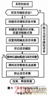從音頻編解碼器中獲取數(shù)據(jù)時(shí),首先通過UDA1341TS采集語音信號放入語音捕捉緩存區(qū),應(yīng)用程序再從語音捕捉緩沖獲取語音信號并發(fā)送。具體程序流程如圖5所示。