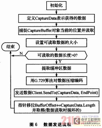 數(shù)據(jù)發(fā)送函數(shù)的作用是將語音捕捉緩沖區(qū)的數(shù)據(jù)通過Client.SendTo(CaptureData,EndPoint)函數(shù)發(fā)送到網(wǎng)絡(luò)上。當(dāng)線程發(fā)現(xiàn)有數(shù)據(jù)要讀取(即線程被觸發(fā))時(shí),就會(huì)循環(huán)調(diào)用數(shù)據(jù)發(fā)送函數(shù),直到?jīng)]有可讀的數(shù)據(jù)為止。CaptureBuffer為語音捕捉緩沖區(qū)對象。數(shù)據(jù)發(fā)送流程如圖6所示。