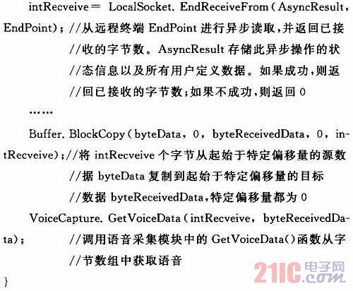 數(shù)據(jù)接收函數(shù)的功能主要是調(diào)用GetVoiceData()函數(shù)從網(wǎng)絡(luò)中接收語音數(shù)據(jù)并放入緩沖區(qū)。代碼如下: