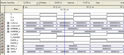 使用的信號包括:數(shù)據(jù)信號data_a,dat_b;讀寫有效信號wren_a,wren_b;地址信號address_a,address_b;時(shí)鐘信號clock_a,clock_b;輸出數(shù)據(jù)信號q_a,q_b。可以看到所有的信號都是成對出現(xiàn)的,就是為了進(jìn)行乒乓方式的數(shù)據(jù)傳輸。分成了兩個(gè)RAM區(qū)域,A和B,相當(dāng)于前面講乒乓方式里的數(shù)據(jù)緩沖模塊1和2。兩個(gè)RAM塊是交替著讀寫(由I_a和I_b決定),輸出數(shù)據(jù)流也是由I決定。剛說到寫時(shí)鐘是13.5M,讀時(shí)鐘是27M,所以clock_a和clock_b必須是讀寫時(shí)鐘切換著輸入,而且地址的計(jì)數(shù)也不一樣,寫周期時(shí)候地址增加的時(shí)鐘是13.5M,讀周期地址增加的時(shí)鐘是27M。所以每行的數(shù)據(jù)讀了兩遍,相當(dāng)于隔行變逐行。圖6在Qartus II下RAM的乒乓操作功能仿真圖: