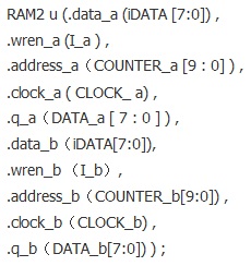 方法2 可以這樣實(shí)現(xiàn):在FPGA內(nèi)部使用Megacore,構(gòu)造一個(gè)雙口的RAM,雙口RAM的輸入輸出信號的硬件描述語言定義如下: