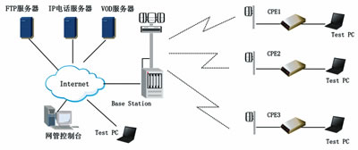 上文介紹的主要測試領(lǐng)域側(cè)重實(shí)驗(yàn)室環(huán)境,運(yùn)營商在對設(shè)備經(jīng)過一定程度上的實(shí)驗(yàn)室測試后,一般會進(jìn)一步進(jìn)行外場測試。在外場測試中,覆蓋、容量、多終端下的QoS保證、移動性、長時傳輸能力等方面將成為重點(diǎn)的測試內(nèi)容,下面就針對固定WiMAX技術(shù),對其部分外場測試內(nèi)容進(jìn)行介紹(典型外場測試框圖參考圖3)。