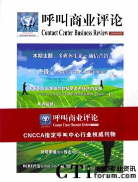 《呼叫商業(yè)評(píng)論》(Contact Center Business Review )是一本服務(wù)于呼叫中心行業(yè)企業(yè)高管人群的高端雜志,是CNCCA呼叫中心及客戶關(guān)系管理協(xié)會(huì)指定呼叫中心行業(yè)權(quán)威刊物,可作為高端客戶群體的行業(yè)指南,洞悉行業(yè)新舉措,法規(guī)新動(dòng)態(tài)的風(fēng)向標(biāo)。