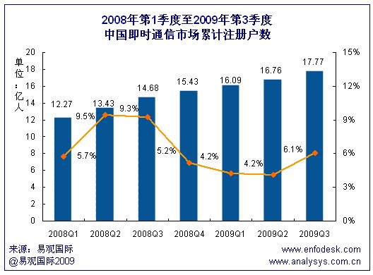 根據(jù)易觀國(guó)際Enfodesk產(chǎn)業(yè)數(shù)據(jù)庫(kù)即將發(fā)布的《2009年第3季度中國(guó)即時(shí)通信市場(chǎng)季度監(jiān)測(cè)》數(shù)據(jù)顯示,2009年第3季度中國(guó)即時(shí)通訊市場(chǎng)累計(jì)注冊(cè)賬戶數(shù)達(dá)到17.77億,環(huán)比增長(zhǎng)6.1%,同比增長(zhǎng)21%。