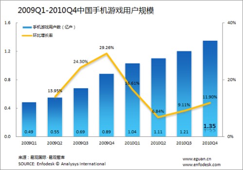 另外,從手機游戲用戶規(guī)模來看,2010年第4季度中國手機游戲用戶數(shù)量達到了1.35億,環(huán)比增長11.9%。