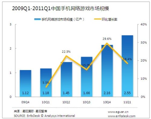 2011年第1季度中國手機網(wǎng)絡(luò)游戲市場規(guī)模達(dá)2.55億