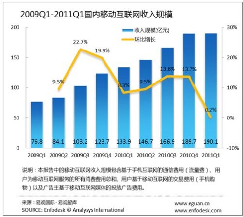 2011年第1季度國內(nèi)移動(dòng)互聯(lián)網(wǎng)收入達(dá)190億元