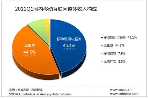 從2011年第1季度移動(dòng)互聯(lián)網(wǎng)收入構(gòu)成,我們發(fā)現(xiàn)移動(dòng)應(yīng)用與服務(wù)仍然是主要營收,占總體市場的45.13%。而流量費(fèi)依然占據(jù)44.45%的份額。而移動(dòng)購物,無線廣告營收占比增長有限,分別占7.89%和2.52%。