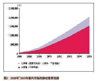 另外一個預測也可說明這一趨勢:2010年到2015年小屏幕移動寬帶連接的復合年均增長率為45%,而大屏幕的復合年均增長率為36%,到2015年新興市場上將有16億的小屏幕連接和近4.59億的大屏幕連接。