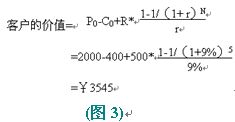 假設客戶與公司保持交易時間:N=5年;公司最初吸引每個客戶的成本(營銷費用): C0=¥400;客戶第一次購買的產(chǎn)品價格:P0=¥2000;公司期望每年從每個客戶處增加的收入:R=¥500;利率(一般指貸款利率): r =9%;那么客戶的價值等于:客戶初次購買產(chǎn)品和以后幾年每年消費價值的折現(xiàn)之和,減營銷成本,即: