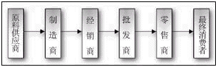 在社會(huì)化大生產(chǎn)的前提下,任何商品被制造和被消費(fèi)的過程,實(shí)際上是在多個(gè)環(huán)節(jié)、多個(gè)商家進(jìn)行“傳遞”的過程,這一過程構(gòu)成的“通道”就是“供應(yīng)鏈”。供應(yīng)鏈的研究就是從分銷模式開始的。在分銷模式下,最常見的價(jià)值傳遞的通道如下圖所示: