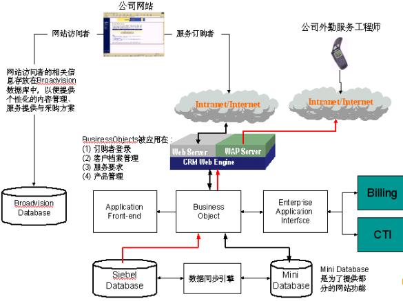 公司挑選了方案一作為客戶數(shù)據(jù)的錄入與存儲方式,即,將Siebel數(shù)據(jù)庫作為公司客戶的數(shù)據(jù)中心,并且采用了將數(shù)據(jù)直接錄入到Siebel數(shù)據(jù)庫的方法。同時,由于Siebel數(shù)據(jù)庫中的部分?jǐn)?shù)據(jù)將為網(wǎng)上服務(wù)提供信息,考慮到系統(tǒng)的安全性與性能,公司另建了一個微型數(shù)據(jù)庫,其整體的系統(tǒng)構(gòu)架見下圖。