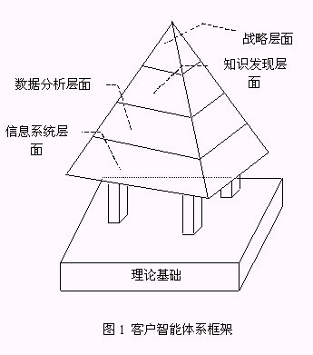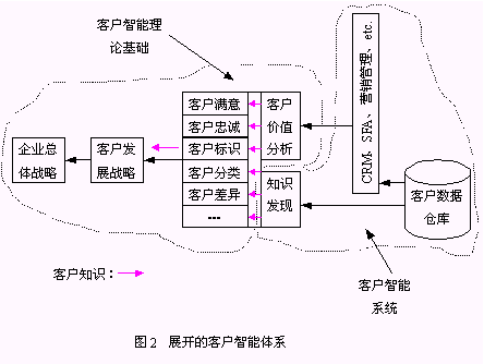 客戶智能系統(tǒng)(CI System)是本文提出的實(shí)現(xiàn)客戶智能的系統(tǒng)平臺。它包括了客戶智能體系中的信息系統(tǒng)層面、數(shù)據(jù)分析層面、知識發(fā)現(xiàn)層面,是基于客戶智能理論的可操作的系統(tǒng)框架。因此,客戶智能體系也可以簡單地用客戶智能基礎(chǔ)理論和基于客戶智能理論的客戶智能系統(tǒng)兩個(gè)邏輯層面表示(圖2);诳蛻糁悄艿腃RM系統(tǒng)是本文描述的客戶智能系統(tǒng)中的一種。