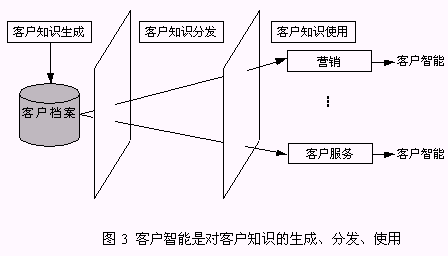 客戶知識是人們通過實(shí)踐認(rèn)識到的、與客戶有關(guān)的規(guī)律性,而客戶智能是獲得客戶知識并使用客戶知識求解問題的能力?蛻糁悄苁菍ζ髽I(yè)戰(zhàn)略決策真正有價(jià)值的事物和行動?蛻糁悄懿粌H包括了客戶知識的生成,而且更強(qiáng)調(diào)了客戶知識在企業(yè)中的分發(fā)、使用,直到產(chǎn)生客戶智能。所以,客戶智能是對客戶知識的生成、分發(fā)和使用(圖3)。