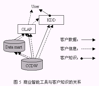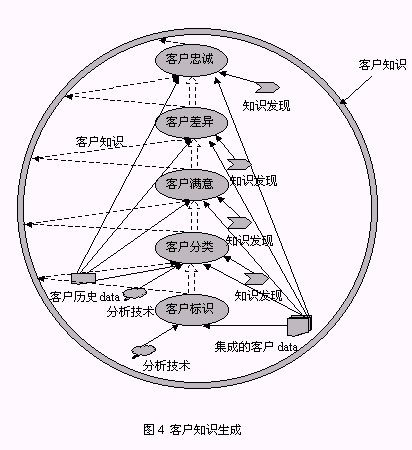 從以上構(gòu)成系統(tǒng)的三個(gè)組件的介紹中同時(shí)可以找到對以下兩個(gè)問題的答案:1、客戶數(shù)據(jù)、客戶信息、客戶知識之間的區(qū)別(圖5):由來自于事務(wù)系統(tǒng),如ERP、SFA等的源數(shù)據(jù)經(jīng)整理后放入CCDW或數(shù)據(jù)集市,這一過程處理的對象稱為客戶數(shù)據(jù);OLAP為決策人員提供了展示有意義的客戶數(shù)據(jù)的機(jī)制,這種有意義的客戶數(shù)據(jù)稱之為客戶信息;客戶數(shù)據(jù)和客戶信息均可以通過KDD技術(shù)的運(yùn)用,提升為對決策有價(jià)值的客戶知識。2、客戶知識生成的途徑:從對第一個(gè)問題的解答中可以知道,客戶知識從KDD作用的對象來看有兩種途徑:KDD作用于客戶數(shù)據(jù)、KDD作用于客戶信息,總之,客戶知識生成是依賴于KDD過程的復(fù)雜的過程。