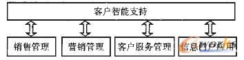(5)客戶智能支持。客戶智能支持處于系統(tǒng)功能平臺的核心地位,若把圖2中的5個模塊比作是人體的不同功能器官,客戶智能支持就相當于人的“大腦”。雖然CRM應用系統(tǒng)中其他模塊也具各一定的數(shù)據統(tǒng)計分析能力,但它們的主要功能定位在業(yè)務操作和客戶協(xié)作層面,客戶智能支持模塊則是完整的、以輔助決策為設計目標的分析型應用,其基礎數(shù)據來自于各CRM業(yè)務流程運行產生的大量數(shù)據及企業(yè)其他應用系統(tǒng)數(shù)據。
