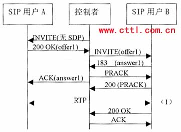 控制者再向B發(fā)送一個(gè)沒(méi)有SDP的INVITE。B應(yīng)答的200 0K響應(yīng)中包含一個(gè)提供offer2,控制者應(yīng)該基于offer2向A發(fā)送一個(gè)re-INVITE,注意。offer2可能需要稍作修改來(lái)滿足媒體要求。例如如果offer1包含一個(gè)音頻和一個(gè)視頻行,而offer2只有一個(gè)音頻行,控制者就需要在offer2中增加一個(gè)視頻行(端口設(shè)為O)來(lái)構(gòu)成offer2’。由于這是一個(gè)re-INVITE,所以通常應(yīng)該能立即收到響應(yīng)。A的200