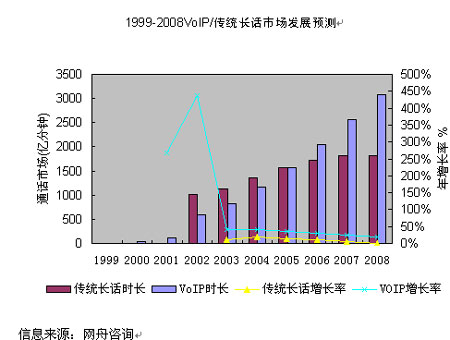 2000年以來,IP長話憑借明顯的資費優(yōu)勢,對傳統(tǒng)長話形成了有力的競爭,在通話量上已趕超了傳統(tǒng)長話。也正是由于IP長話的低資費,在其通話量大幅度增加的同時,也導(dǎo)致了國內(nèi)長話網(wǎng)總體收入的下降,長途電話IP化的趨勢十分明顯?傮w而言,中國VoIP市場仍蘊藏著非常大的潛力,按照3G和NGN的部署速度,